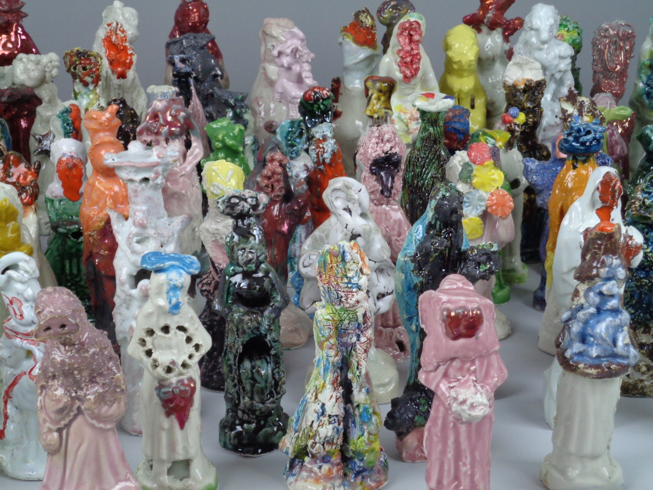 - Divinities & Idols, 2018, slipped, glazed terracotta, overglaze, in-glaze luster, luster, decals, 25cm H max