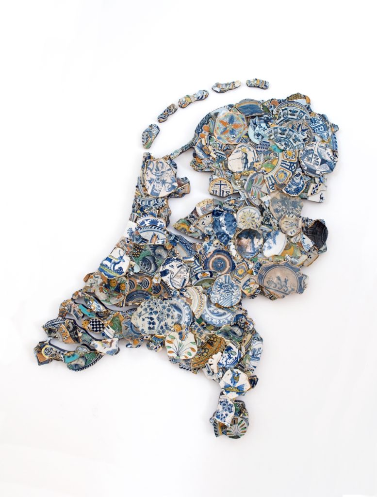 - Majesteit, Bouke de Vries, 2024, Life-sized double portrait of King Willem-Alexander and Queen Maxima, fragments of 17th and 18th century Delftware, 183 x 204 cm, courtesy Bouke de Vries