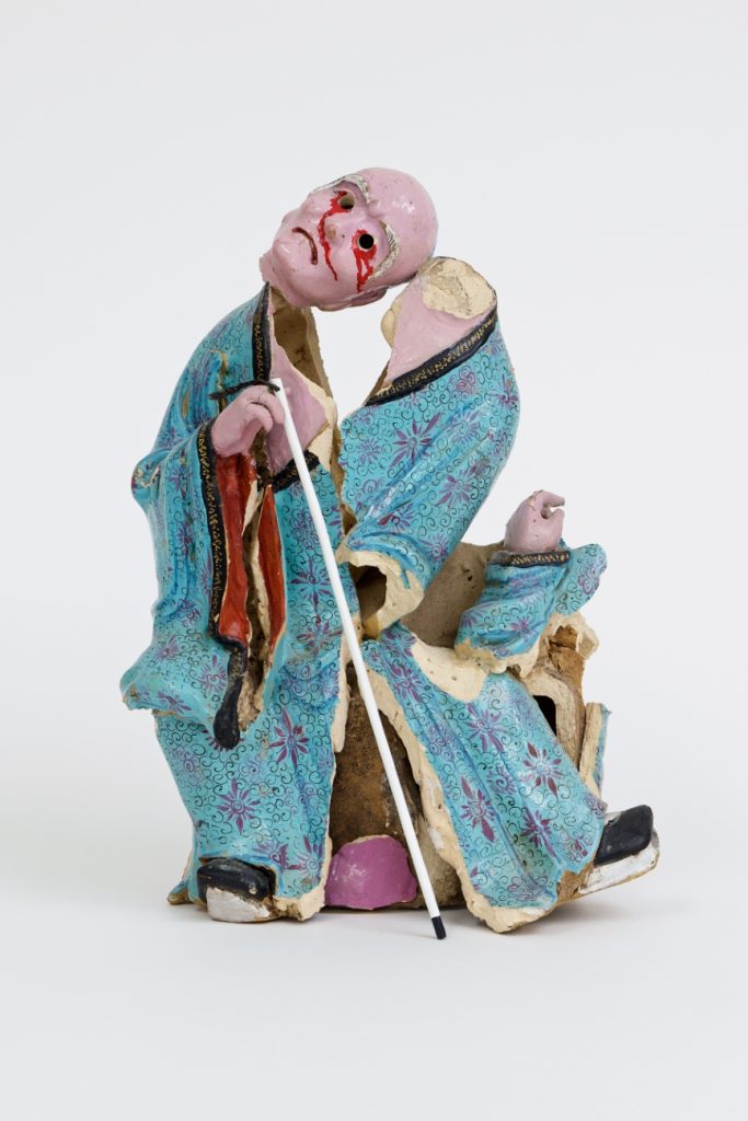 Many of the works on view are based on historical objects, yet they also engage with a wide range of contemporary cultural phenomena and elements from the artist’s personal world. Playful references, such as a porcelain sculpture of Marge Simpson as Guan Yin, and other childhood memories appear alongside tributes to the artist’s father and husband, as well as allusions to drug culture and war.