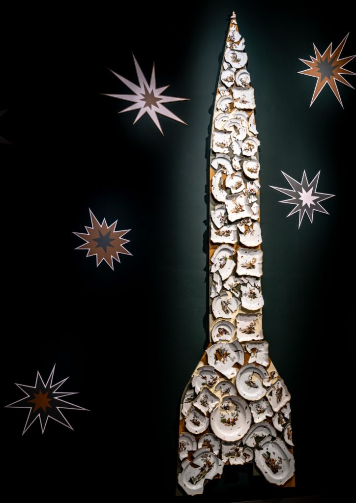 - Porcelain Vengeance (V2 Rocket), 2024, 18e-eeuws Meissen-porselein, messing, gemengd materiaal, as displayed in the National Museum of Ceramics Princessehof (Leeuwarden, NL), Courtesy of Bouke de Vries, Galerie Ron Mandos, Amsterdam. Photo by Jacob van Essen/ Fotobureau Hoge Noorden