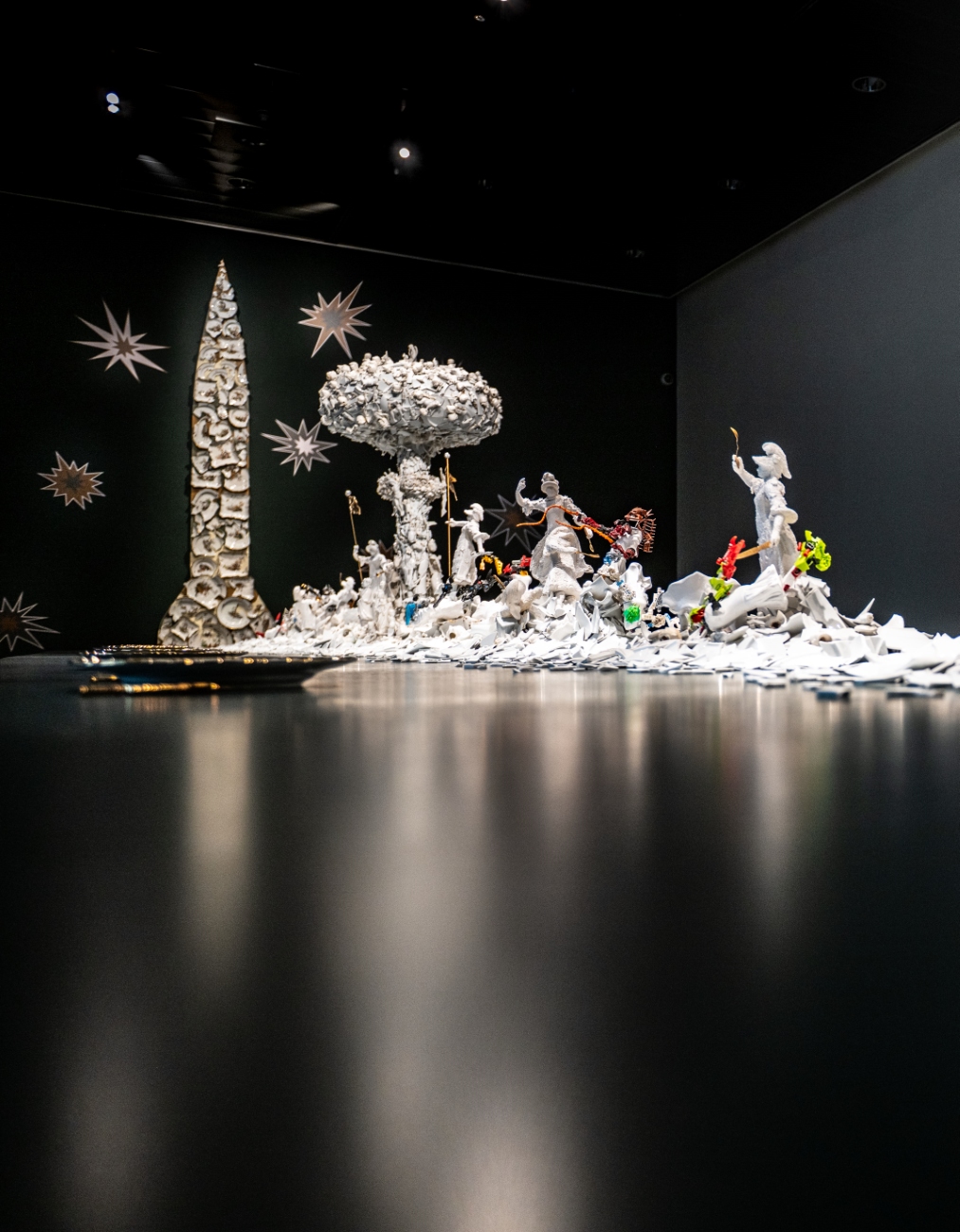 At the heart of this chaotic battlefield of shards stands a dramatic and inevitable centrepiece – the ultimate act of war: a nuclear mushroom cloud composed of countless fragments of white porcelain. The cloud is formed from ghostly cherubs, skulls, and decapitated or distorted porcelain dolls – or “Hummels gone wrong,” as De Vries calls them. Christ on the cross and Guan Yin, the Chinese goddess of compassion whose name means “One who hears the world’s cries,” witness the death and destruction; atop the cloud, an angel weeps.
