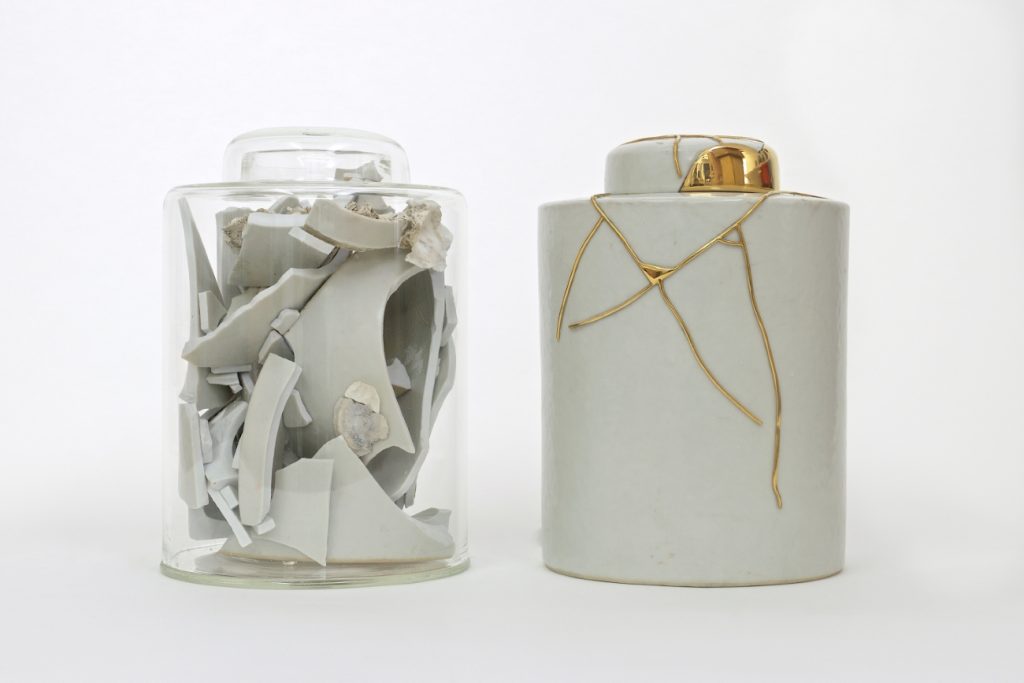 Next, Early Chinese explores Bouke de Vries’ quest for a deeper human connection with ceramics throughout history, and the prominent role ceramics play within archaeology. A striking example is his response to Ai Weiwei’s conceptual and political photo triptych ‘Dropping a Han Dynasty Urn’. De Vries responds with humour and tenderness: “I saw the photos and, in my mind, I picked up the shards and put the vase back together.” By repairing a similarly broken Han vase (dating from 206 BCE to 220 CE), he engages with the enduring value of this cultural heritage. Using the Japanese technique of Kintsugi – developed only in the late fifteenth century – he visibly mends the vase, merging ceramic traditions from different times and places.