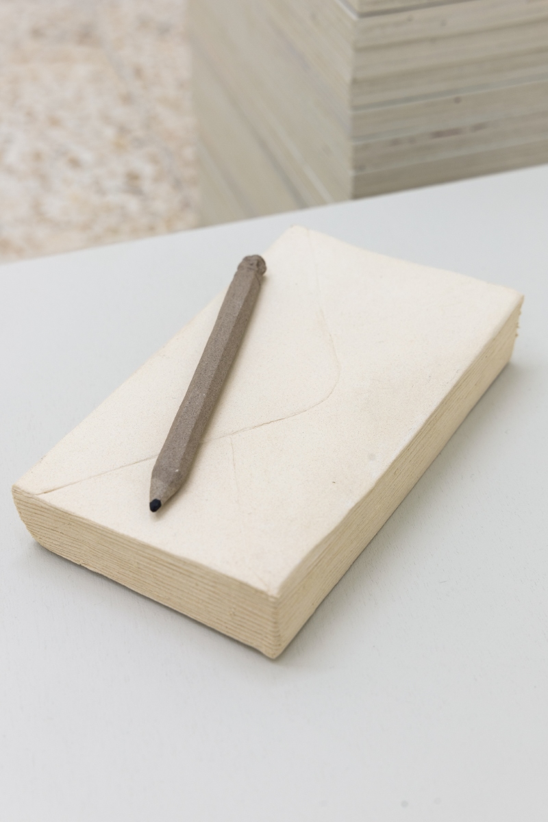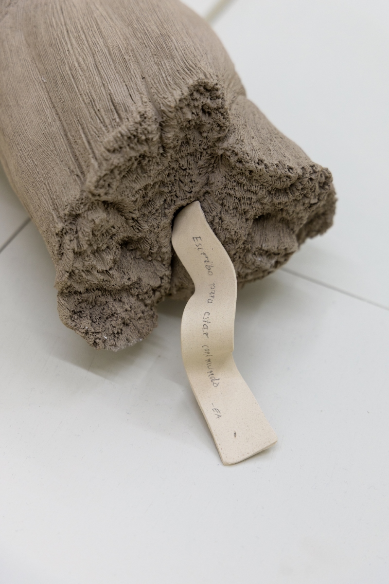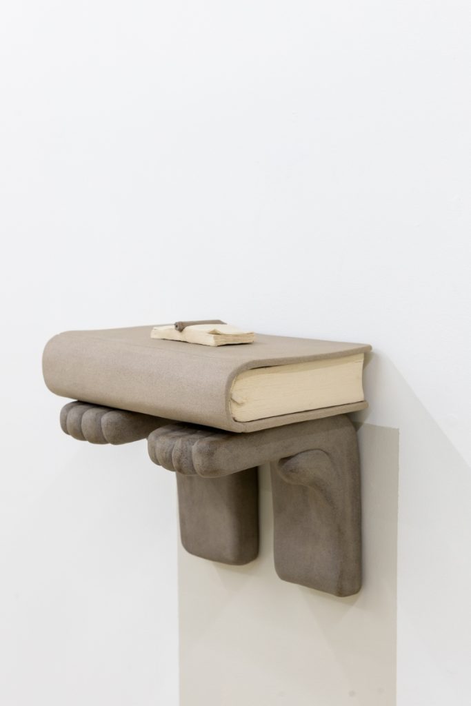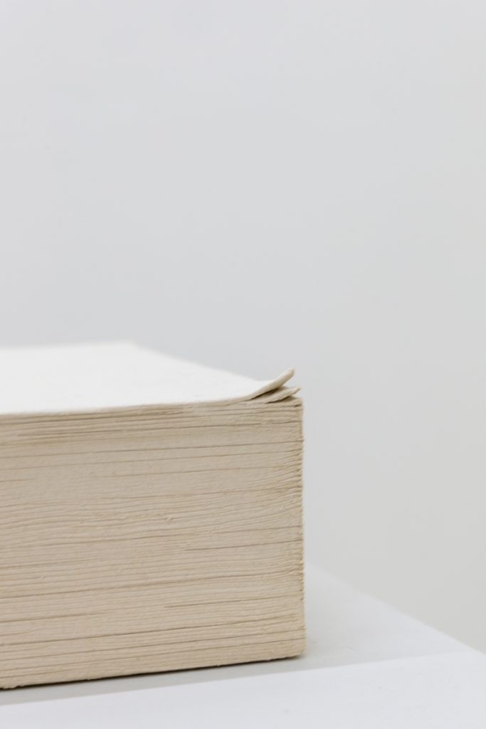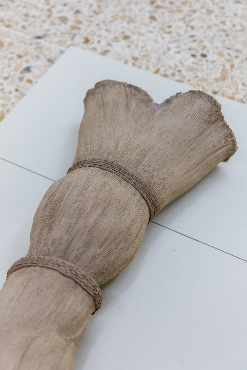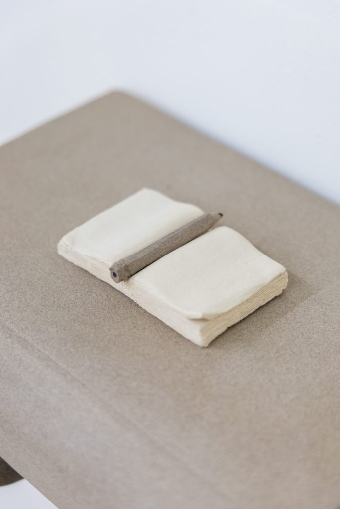 The translation of recognizable objects —such as a desk, a book, a hanger, a pile of papers and a tassel— into ceramics reminds us that what we see is not always what we think. Stripped of their expected function, it is in their detail and subtlety that the invitation to pause and soften emerges. Her objects transcend figuration, conveying a sense of protection: everything seems to preserve something precious, only partially revealed.