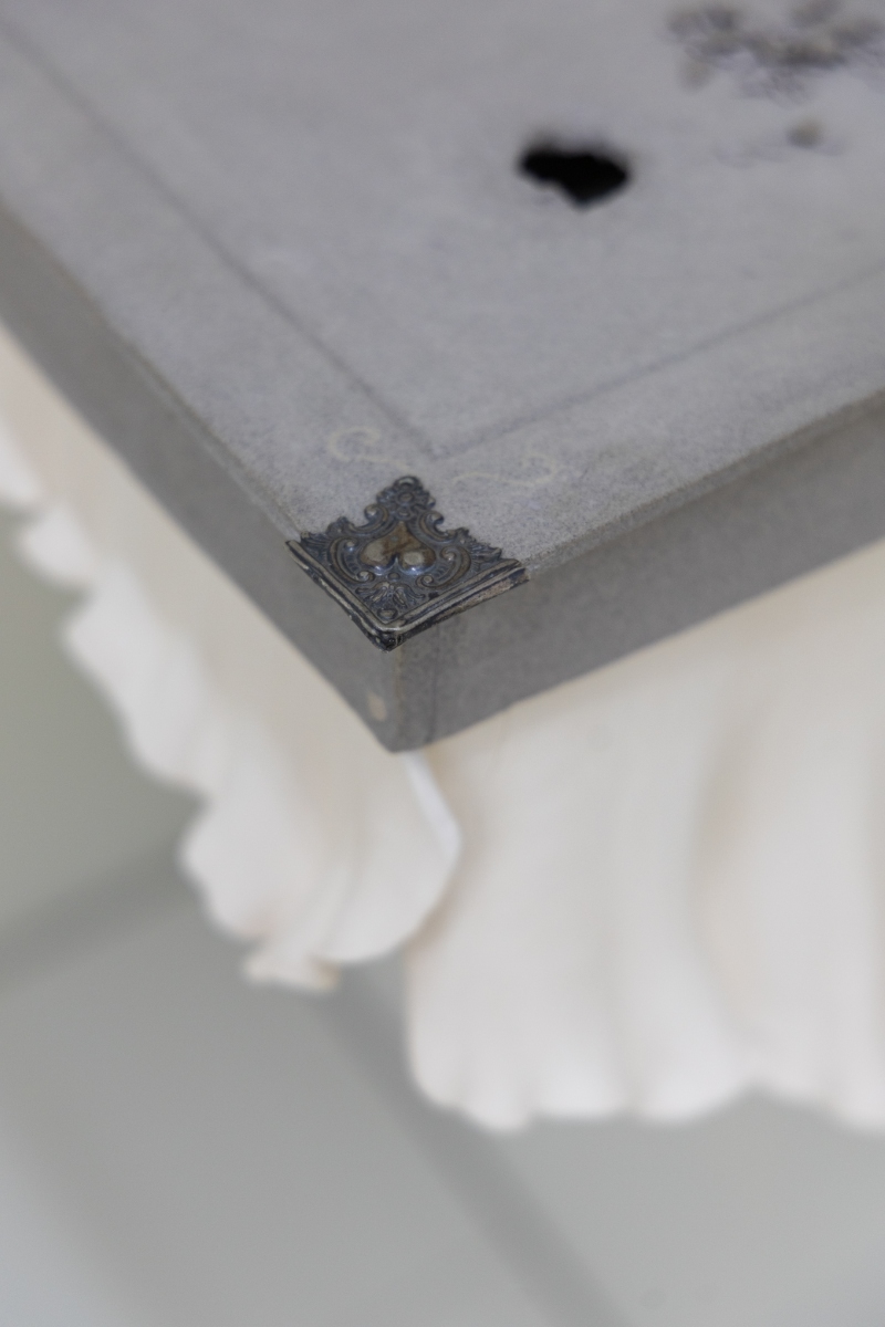 The viewer encounters a carefully guarded world: they can’t read the book, discern the contents of a relic-like safebox, or know what the implied bag holds. Access to this symbolic space is intentionally limited, creating a personal and protected realm where the recollection of her grandmother’s voice can quietly inhabit and resonate.