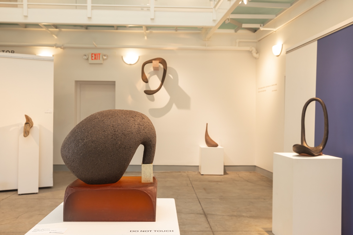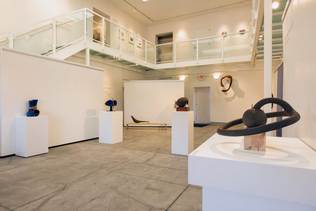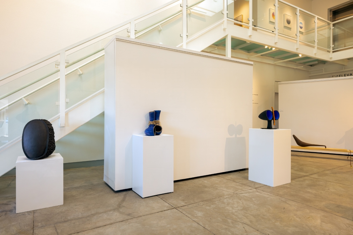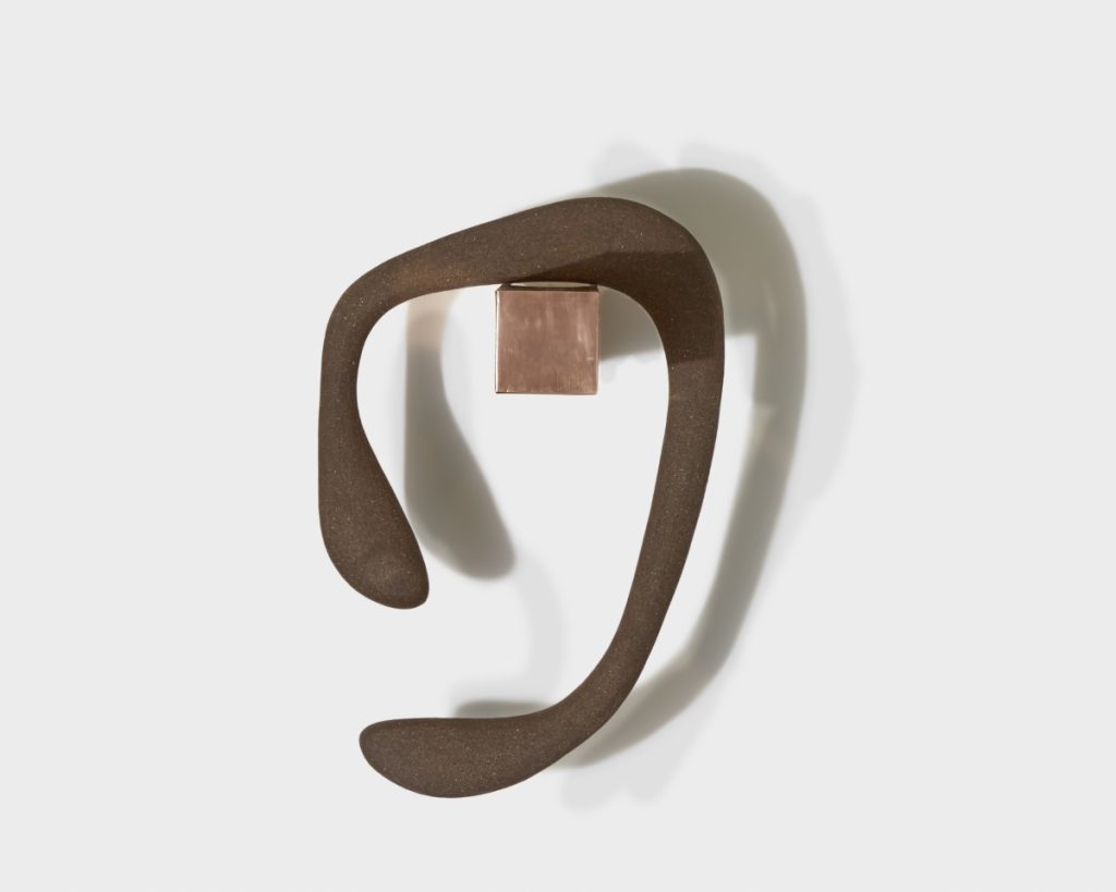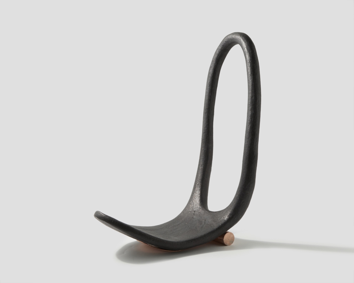 Abrams merges her deep knowledge of architecture and design with her fascination for materials, ignited by touching clay slip at a crafts school during a conference in the early 2000s. That tactile epiphany led her to pivot from her long-established career as a writer to become a practicing artist. Visual witticism runs through her vocabulary of ceramic elements—rods, loops, hoops, tapered or teardrop forms—while their armatures in wood, metal, rawhide and rubber seem like responses to structural riddles. Balancing Acts presents an array of objects that hang, perch, or float on their bases, illustrating how the weight and fragility of clay can serve as its own fulcrum. Within the architecture of precarity and acrobatics with gravity of Abrams’s work is the spirit of play.