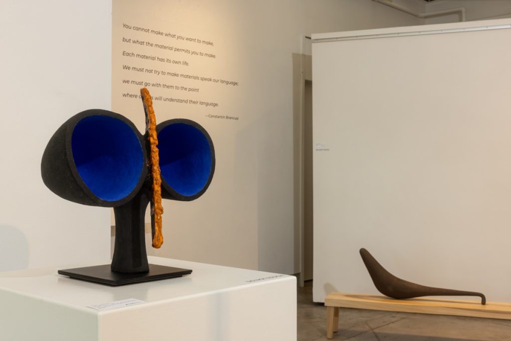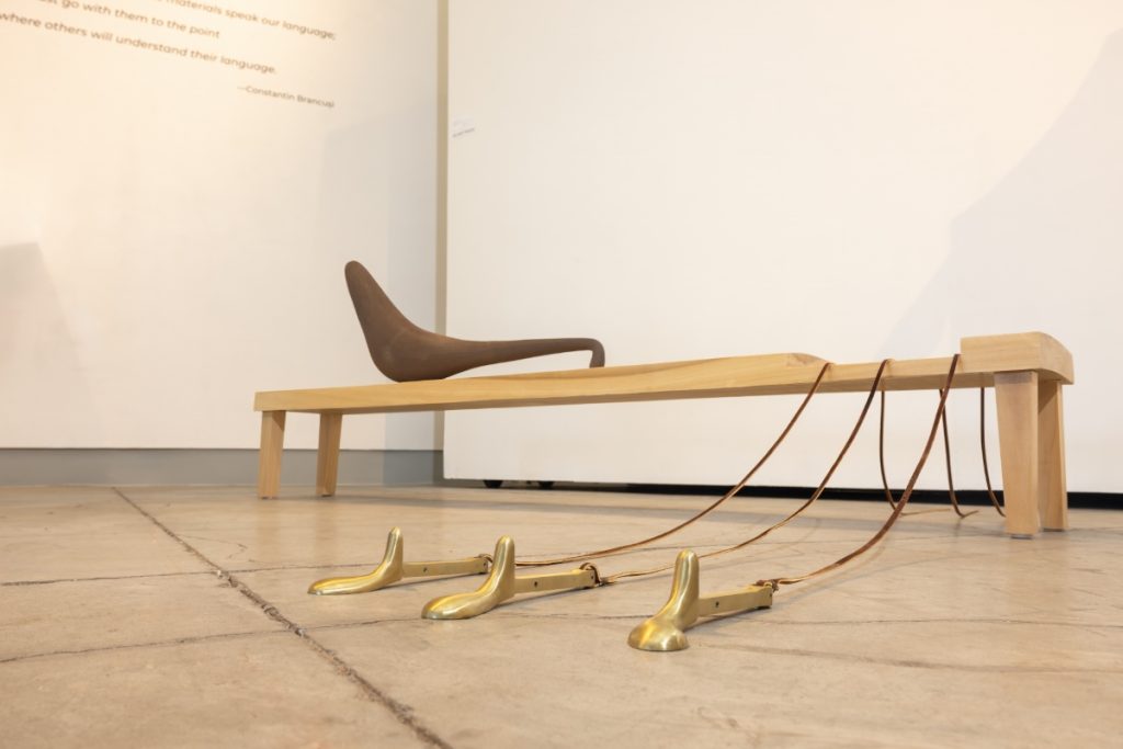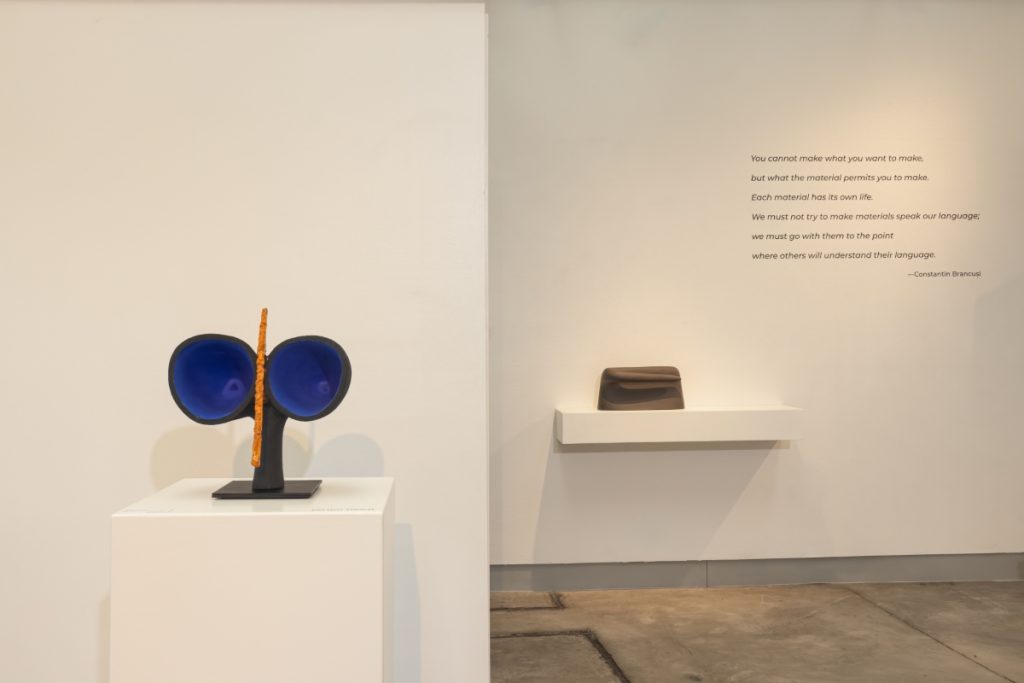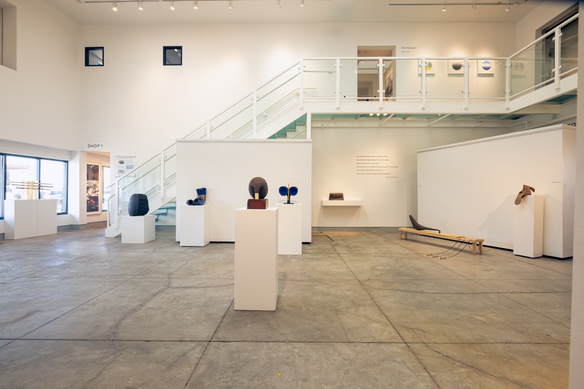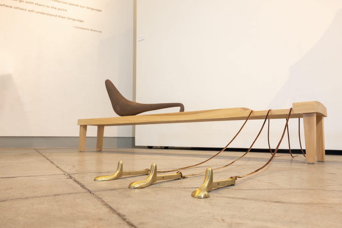Abrams merges her deep knowledge of architecture and design with her fascination for materials, ignited by touching clay slip at a crafts school during a conference in the early 2000s. That tactile epiphany led her to pivot from her long-established career as a writer to become a practicing artist. Visual witticism runs through her vocabulary of ceramic elements—rods, loops, hoops, tapered or teardrop forms—while their armatures in wood, metal, rawhide and rubber seem like responses to structural riddles. Balancing Acts presents an array of objects that hang, perch, or float on their bases, illustrating how the weight and fragility of clay can serve as its own fulcrum. Within the architecture of precarity and acrobatics with gravity of Abrams’s work is the spirit of play.