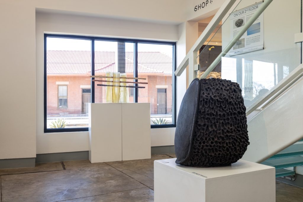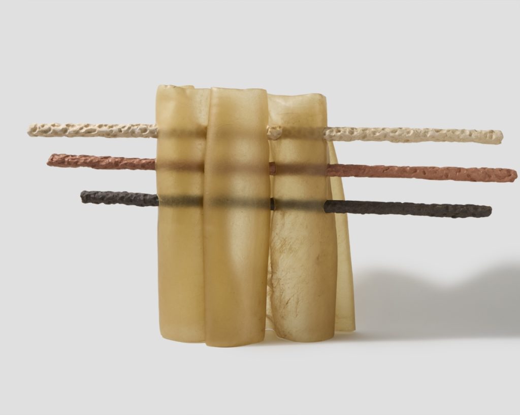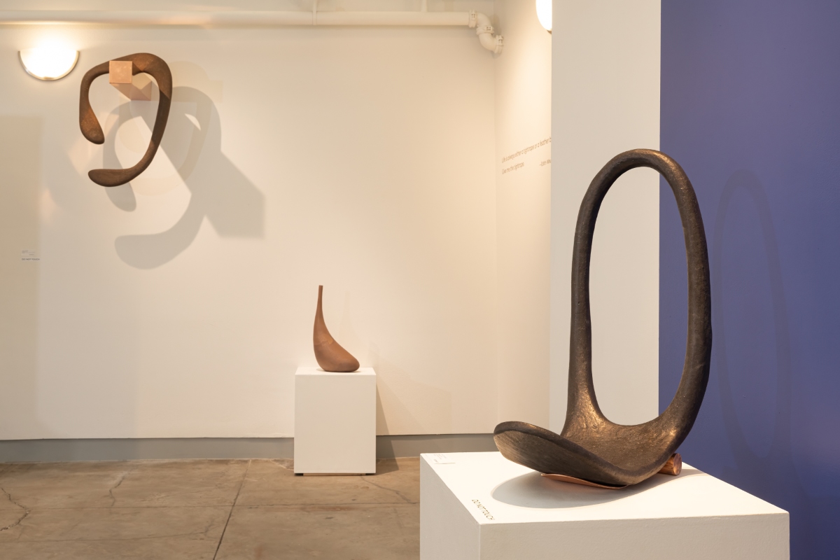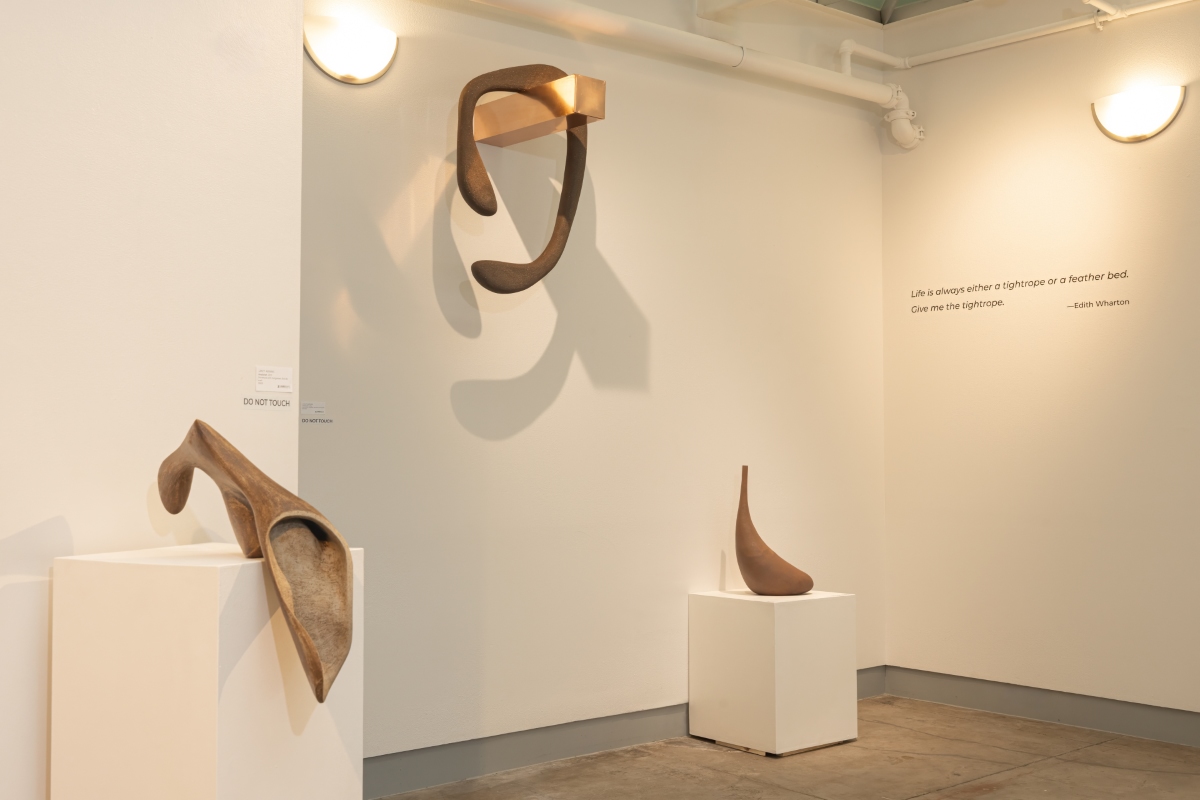 Early works from the exhibition, such as Vicissitude and Involution, show her interest in flowing, organic clay forms resting on rectilinear supports: dangling from a cantilevered copper bar or hanging over a horizontal surface. Later works, like Gather and Kernel, set the natural hues of high- and low-fire clay bodies against semi-translucent materials, allowing an interplay between the obduracy of solid objects and the muted light that filters through rawhide or urethane rubber. Zane Bennett gallery director Carina Evangelista notes: