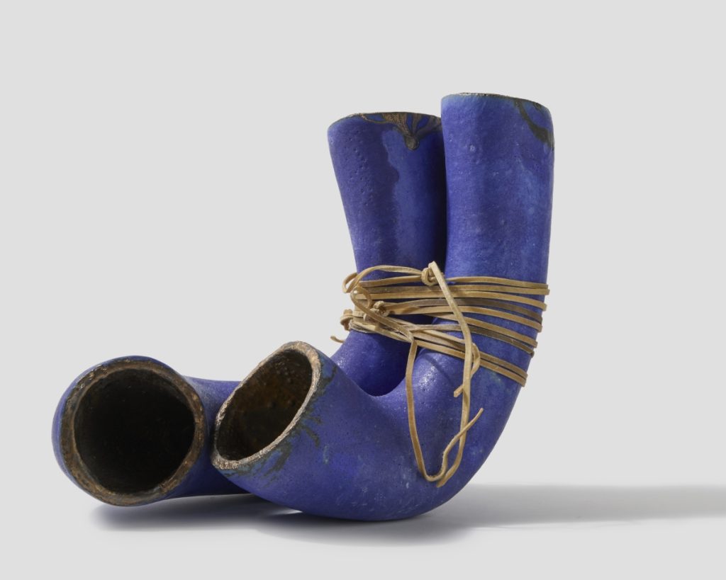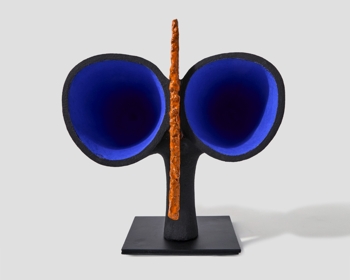 - Janet Abrams, Homage to C.S., 2017, Glazed ceramic with manganese dioxide wash, Iris blue glaze (matte), and orange glaze (gloss), 15 1/2 x 15 x 10 in / 39.4 x 38.1 x 25.4 cm
