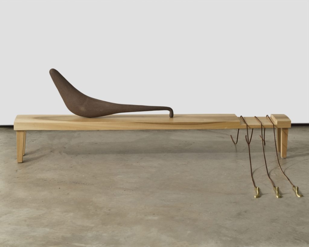- Janet Abrams, Sostenuto, 2010, Unglazed, bisque-fired stoneware, poplar, leather, and brass piano pedals, Stoneware: 20 x 38 x 6 in / 50.8 x 96.5 x 15.2 cm. Poplar: 10 x 72 x 10 in / 25.4 x 182.9 x 25.4 cm. Leather: 60 in / 152.4 cm. Brass piano pedals: 7 in / 17.8 cm