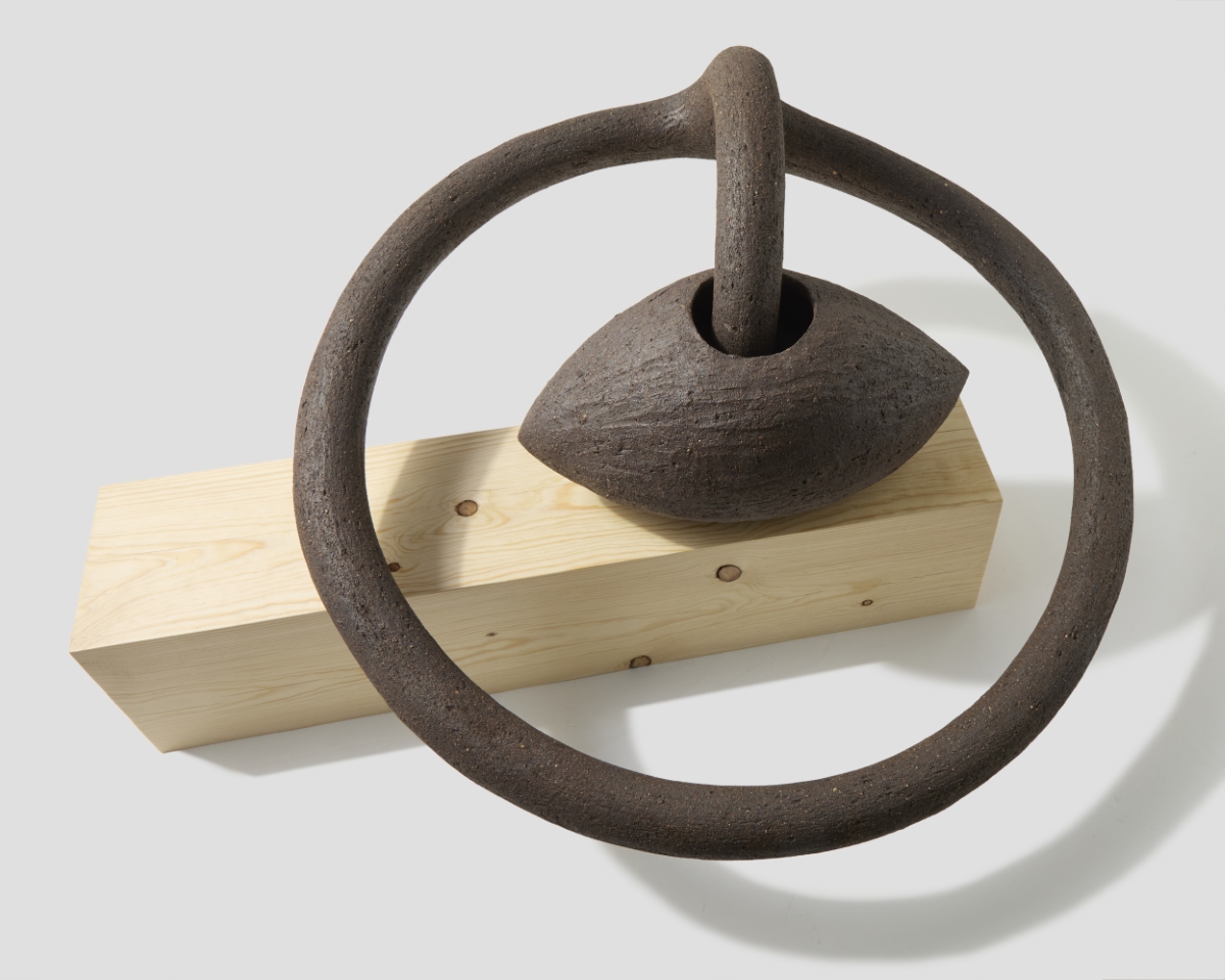 - Janet Abrams, Orbital, 2016-2025, Ceramic (Black Mountain Sculpture Clay) and pine, Ellipse: 7 x 22 x 2 in / 17.8 x 55.9 x 5.1 cm. Base: 5 1/2 x 24 1/2 x 5 1/2 in / 14 x 62.2 x 14 cm