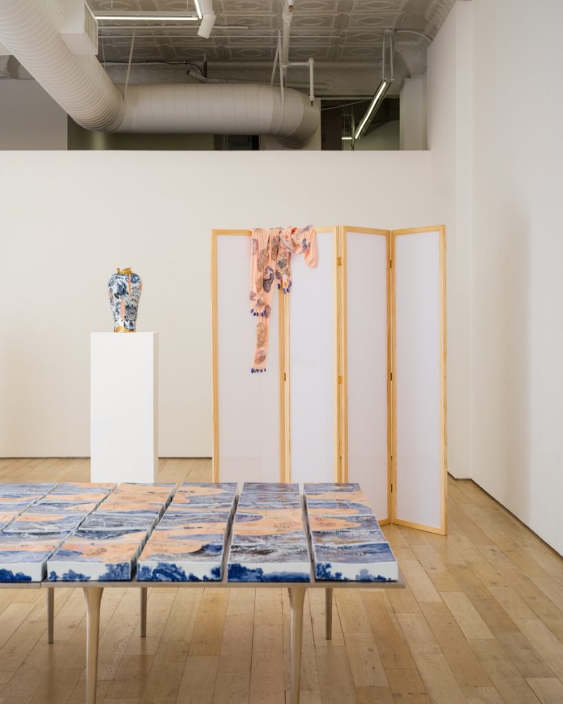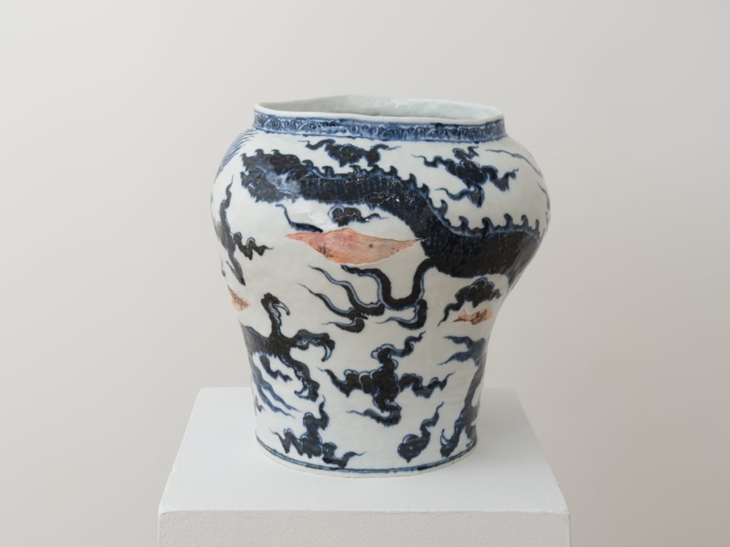 A semi-transparent paneled silk screen further divides up the gallery, concealing a number of porcelain vessels that appear to crack and splinter. As their blue-and-white surface falls away, a wrinkled underlayer resembling skin is revealed. Wang has developed a deft technique for imprinting texture into porcelain which gives it the appearance of actual flesh. Intercut with her sculptures’ sinuous blue-and-white imagery, stretches of skin are revealed as grizzly reminders of the human cost of the globalizing project. Throughout, the delicate materiality and translucence of porcelain — which itself summons comparison with bone and skin — is refigured not only as canvas but as a quasi-corporeal body, marked by the ambitions of commerce and the aftermath of empire.