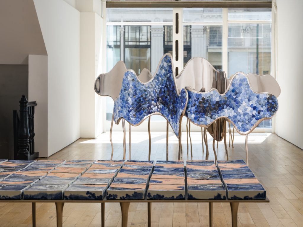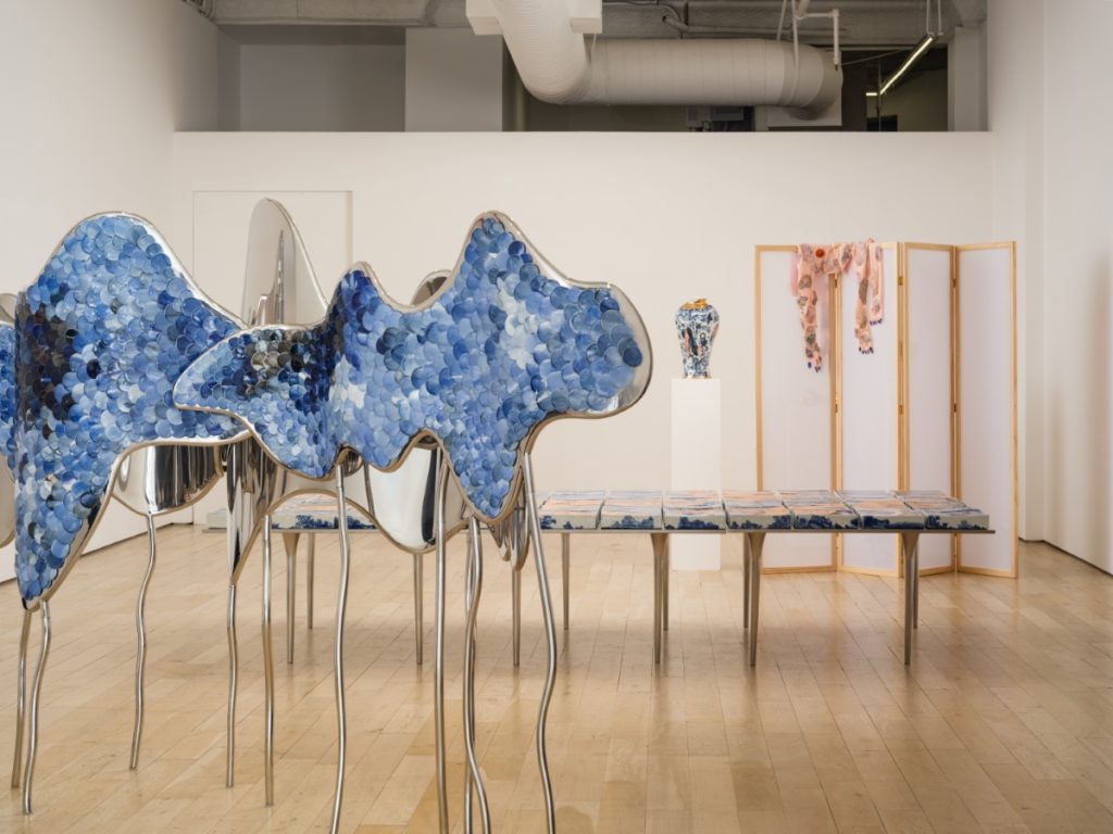 The hallucinatory scene of Wang’s exhibition is introduced through a pair of two-meter-wide metal screens which take the form of a mountainous coastline. These screens, titled On the Other Side of the World, are inset with thousands of minute porcelain plates pigmented in the evocative blues and whites of Delftware. Produced in Jingdezhen, China, Wang’s hand-painted plates scintillate, reflecting light like the fragmented surface of the ocean. As with her previous work The Silk Roads, presented at Kunsthall Grenland in 2019, the diminutive plates combine en masse to form a rippling abstract field. The enumeration of cobalt-glazed porcelain rounds gestures to the ebb and flow of tides, currents, and waterways; its form might also be seen as coin-like tokens of exchange or the scales of a vast sea creature. Inevitably, the work touches on themes of landscape and national borders, trade routes and continental rifts. The vibrant fields of color draw the eye through nebulous gyres and into uncertain terrain, much like the clouded mountain scenes of traditional Chinese scroll paintings.