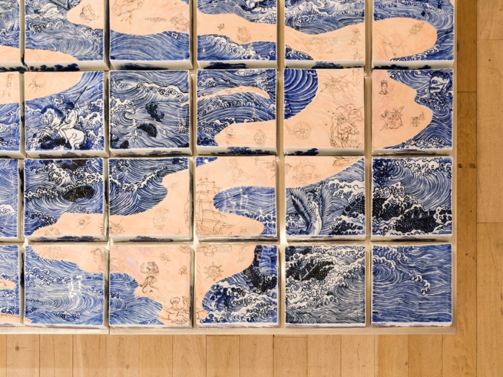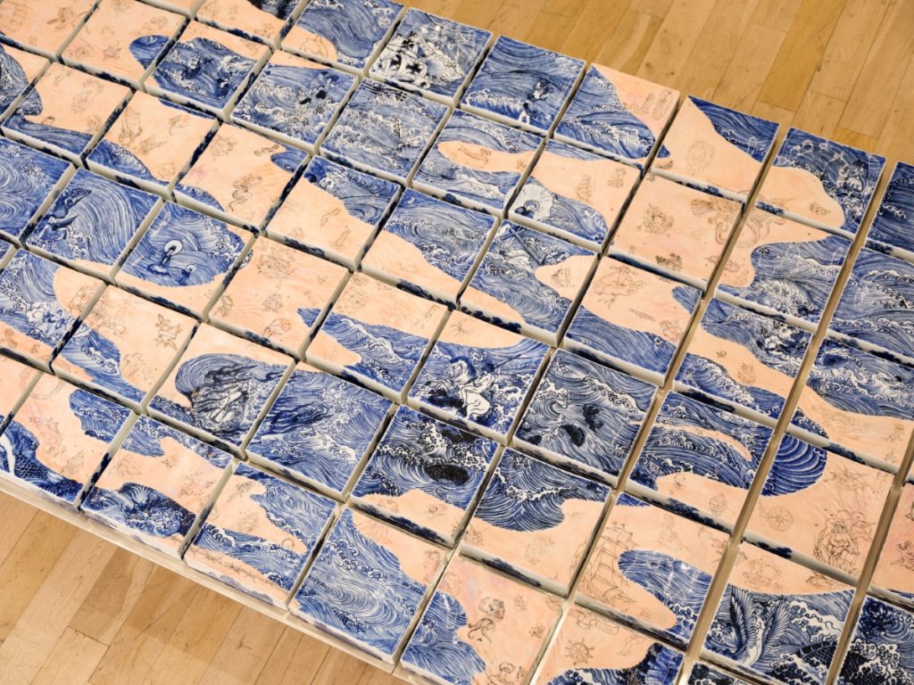 Moving further into the gallery, the viewer discovers Porcelain Flesh Table, a rigid steel structure supporting 72 porcelain bricks with imagery of crashing waves. Wang has long been interested in sailors and their experience traveling between countries and cultures; theirs is a lifestyle situated on the periphery of society, yet which allows them to take up the mantle of cultural ambassador and myth maker, returning home not only with fine porcelain wares and spices but extravagant tales as well. Of particular interest to Wang, sailors carried back a visual record of otherness embedded in their skin via the elaborate tattoos they acquired in foreign ports — sometimes bawdy and profane, at others poetic or expressive of religious reverence. Porcelain Flesh Table interweaves the iconography of traditional blue-and-white “export ware” patterning with these images of sailors’ tattoos to startling effect. Other images appear like reflections tossed about by the waves, including mythic Buddhist and Christian deities and the fantastic creatures populating the terra incognita of early maps.