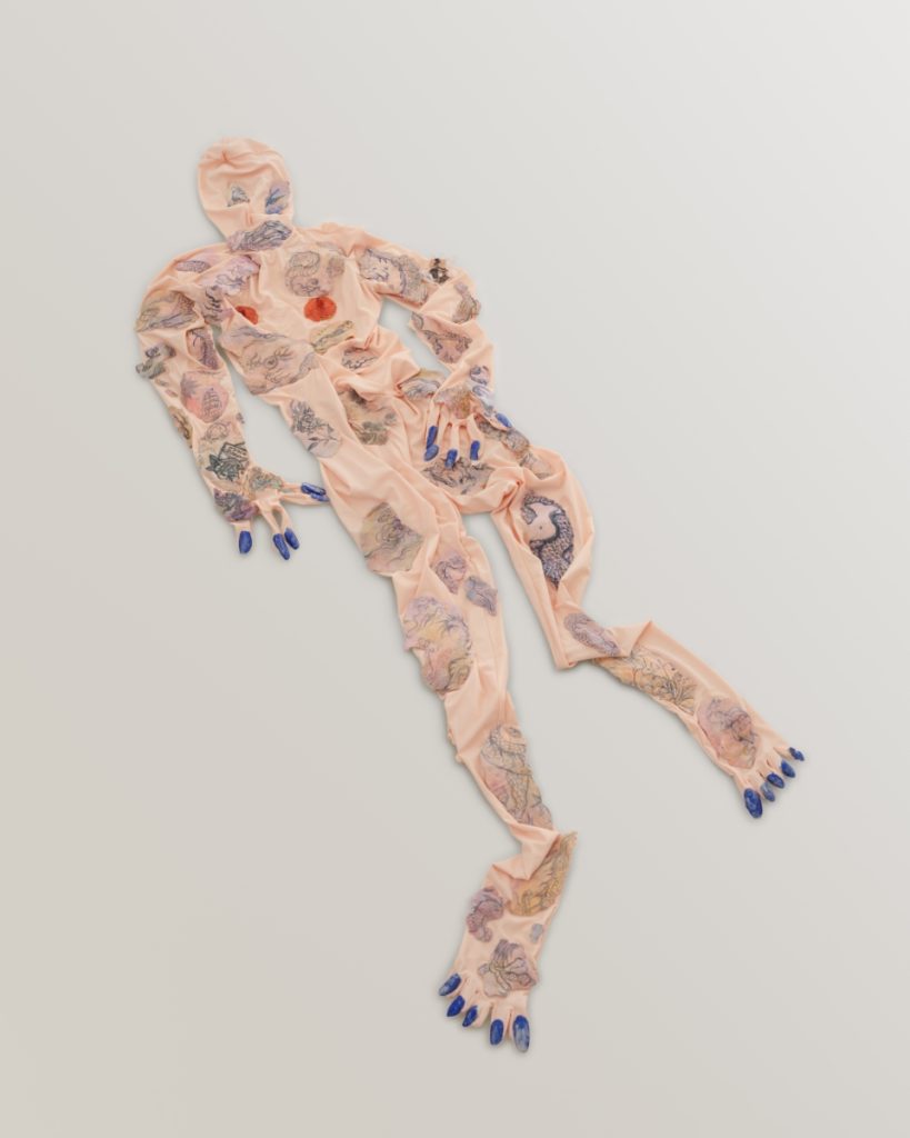 Both Porcelain Flesh Table and I Never Saw the East Coast until I Moved to the West function as piecemeal ossuaries, still lifes in the rich tradition of the Dutch Golden Age, with porcelain bones, internal organs, and fragments of tatted and crinkled skin. In these scenes, reminiscent of the work of artists Adriana Verajão, Tishan Hsu, and Robert Gober whose critiques of bodily autonomy, subjectivity, and the advance of technology fuse subject with object, Wang proffers the ultimate collision between fantasy and reality. Hers is a gothic display of our entanglement in romantic fictions, a fragmentary sculptural tableau serving as evidence for both humanity’s brutality and its transience.