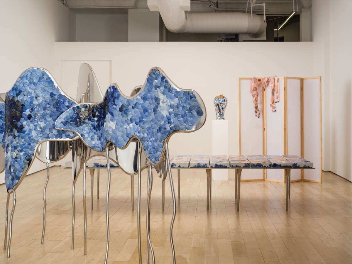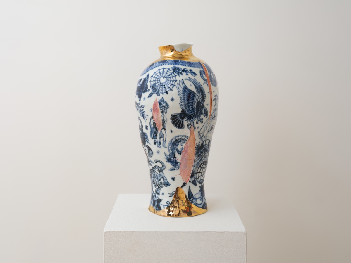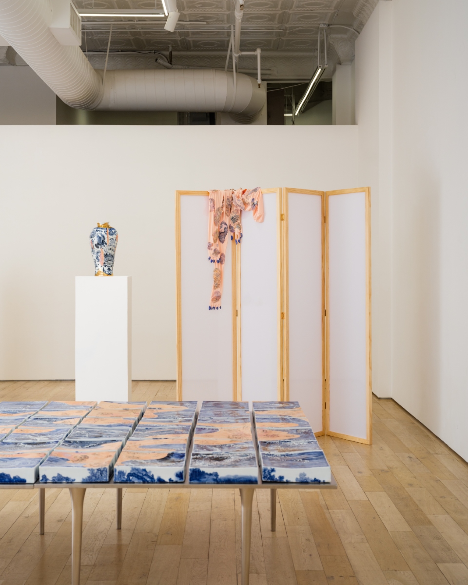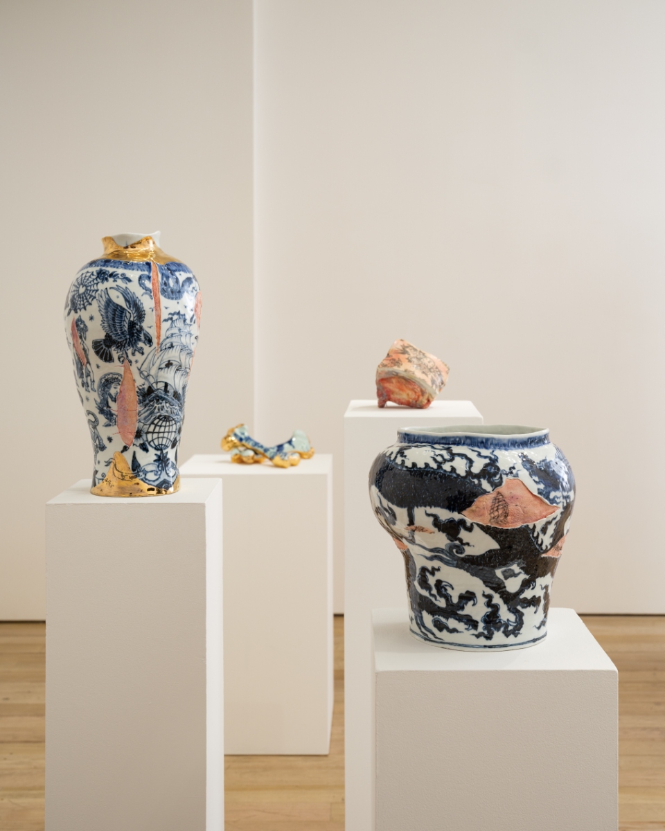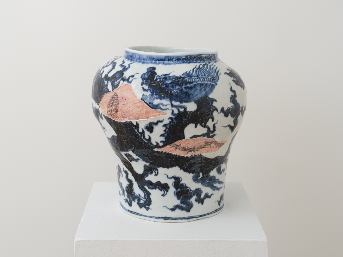 A semi-transparent paneled silk screen further divides up the gallery, concealing a number of porcelain vessels that appear to crack and splinter. As their blue-and-white surface falls away, a wrinkled underlayer resembling skin is revealed. Wang has developed a deft technique for imprinting texture into porcelain which gives it the appearance of actual flesh. Intercut with her sculptures’ sinuous blue-and-white imagery, stretches of skin are revealed as grizzly reminders of the human cost of the globalizing project. Throughout, the delicate materiality and translucence of porcelain — which itself summons comparison with bone and skin — is refigured not only as canvas but as a quasi-corporeal body, marked by the ambitions of commerce and the aftermath of empire.