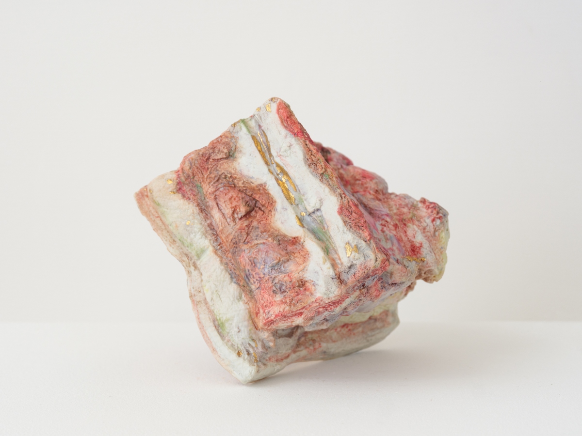 Both Porcelain Flesh Table and I Never Saw the East Coast until I Moved to the West function as piecemeal ossuaries, still lifes in the rich tradition of the Dutch Golden Age, with porcelain bones, internal organs, and fragments of tatted and crinkled skin. In these scenes, reminiscent of the work of artists Adriana Verajão, Tishan Hsu, and Robert Gober whose critiques of bodily autonomy, subjectivity, and the advance of technology fuse subject with object, Wang proffers the ultimate collision between fantasy and reality. Hers is a gothic display of our entanglement in romantic fictions, a fragmentary sculptural tableau serving as evidence for both humanity’s brutality and its transience.