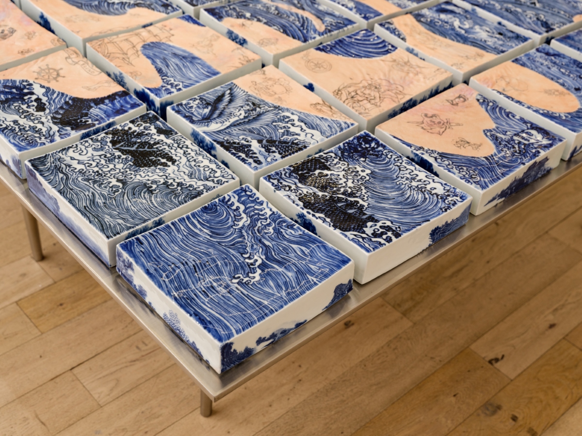 Moving further into the gallery, the viewer discovers Porcelain Flesh Table, a rigid steel structure supporting 72 porcelain bricks with imagery of crashing waves. Wang has long been interested in sailors and their experience traveling between countries and cultures; theirs is a lifestyle situated on the periphery of society, yet which allows them to take up the mantle of cultural ambassador and myth maker, returning home not only with fine porcelain wares and spices but extravagant tales as well. Of particular interest to Wang, sailors carried back a visual record of otherness embedded in their skin via the elaborate tattoos they acquired in foreign ports — sometimes bawdy and profane, at others poetic or expressive of religious reverence. Porcelain Flesh Table interweaves the iconography of traditional blue-and-white “export ware” patterning with these images of sailors’ tattoos to startling effect. Other images appear like reflections tossed about by the waves, including mythic Buddhist and Christian deities and the fantastic creatures populating the terra incognita of early maps.