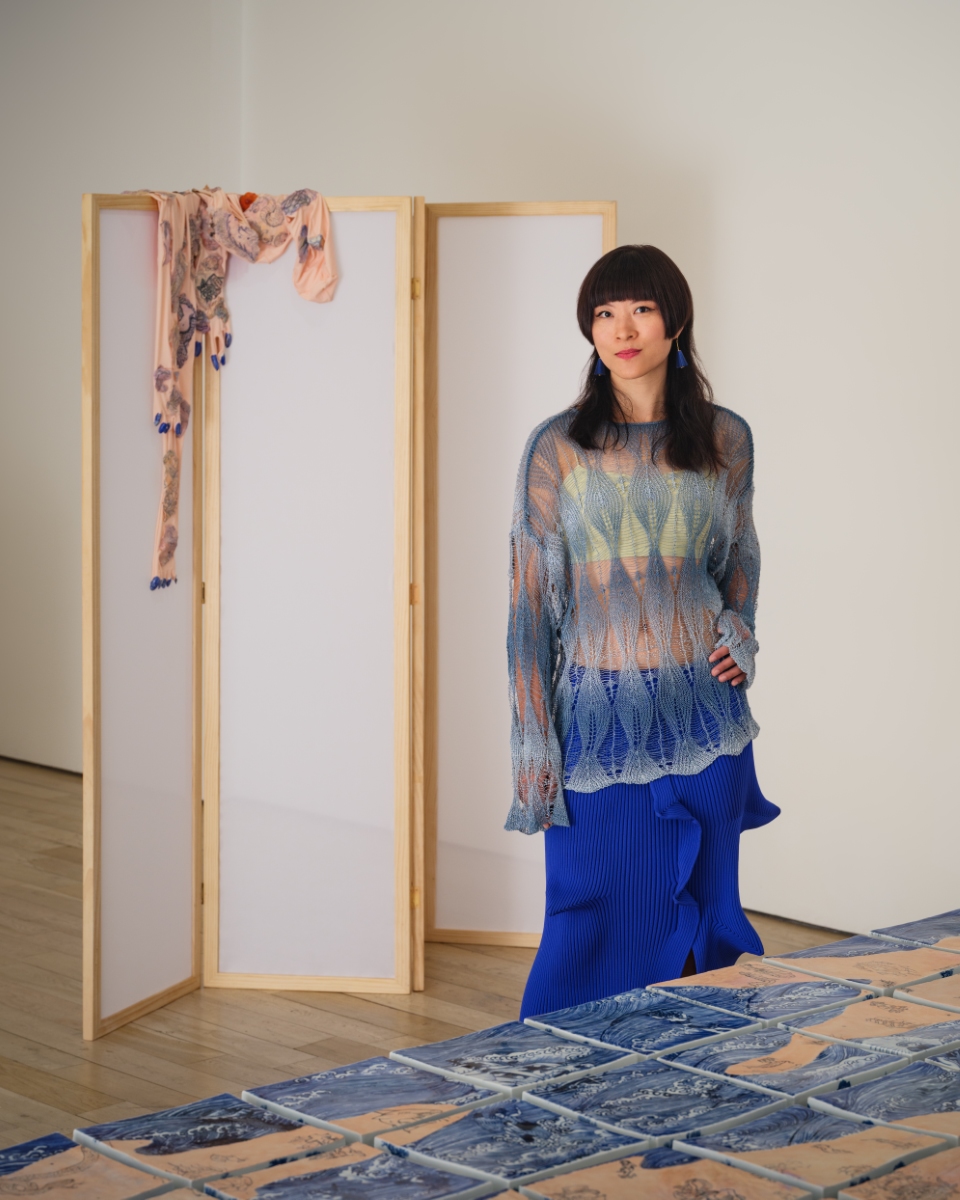 The hallucinatory scene of Wang’s exhibition is introduced through a pair of two-meter-wide metal screens which take the form of a mountainous coastline. These screens, titled On the Other Side of the World, are inset with thousands of minute porcelain plates pigmented in the evocative blues and whites of Delftware. Produced in Jingdezhen, China, Wang’s hand-painted plates scintillate, reflecting light like the fragmented surface of the ocean. As with her previous work The Silk Roads, presented at Kunsthall Grenland in 2019, the diminutive plates combine en masse to form a rippling abstract field. The enumeration of cobalt-glazed porcelain rounds gestures to the ebb and flow of tides, currents, and waterways; its form might also be seen as coin-like tokens of exchange or the scales of a vast sea creature. Inevitably, the work touches on themes of landscape and national borders, trade routes and continental rifts. The vibrant fields of color draw the eye through nebulous gyres and into uncertain terrain, much like the clouded mountain scenes of traditional Chinese scroll paintings.