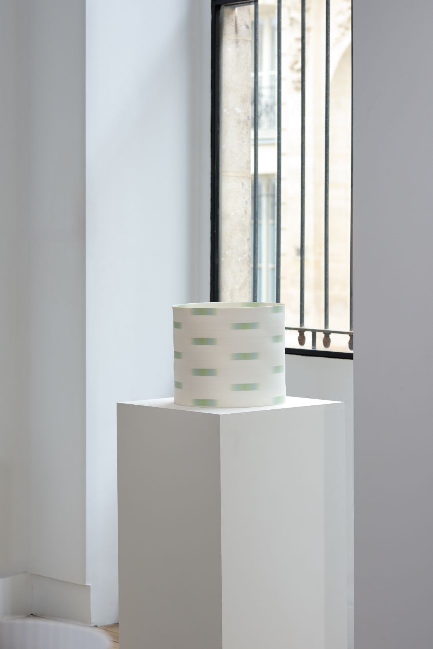 The colour is not applied to the surface but layered into the porcelain itself, becoming part of the material’s inner structure. Westphael’s technique thus defines both form and meaning, and treats colour as something deeply internal. In her works, hues gently dissolve into the porcelain, forming quiet rhythms that echo the textile traditions of Anni Albers and Olga de Amaral, and the minimalist clarity of Agnes Martin.