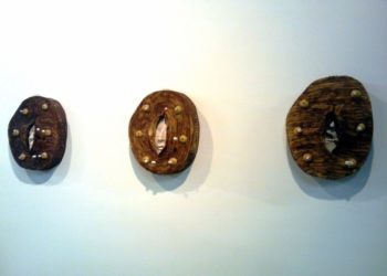 Liliana Folta: Inhale-Exhale-Explode, 2009/10, ceramic installation, oxides, glazes, wood, high temp wire, 14x12x4in (each)